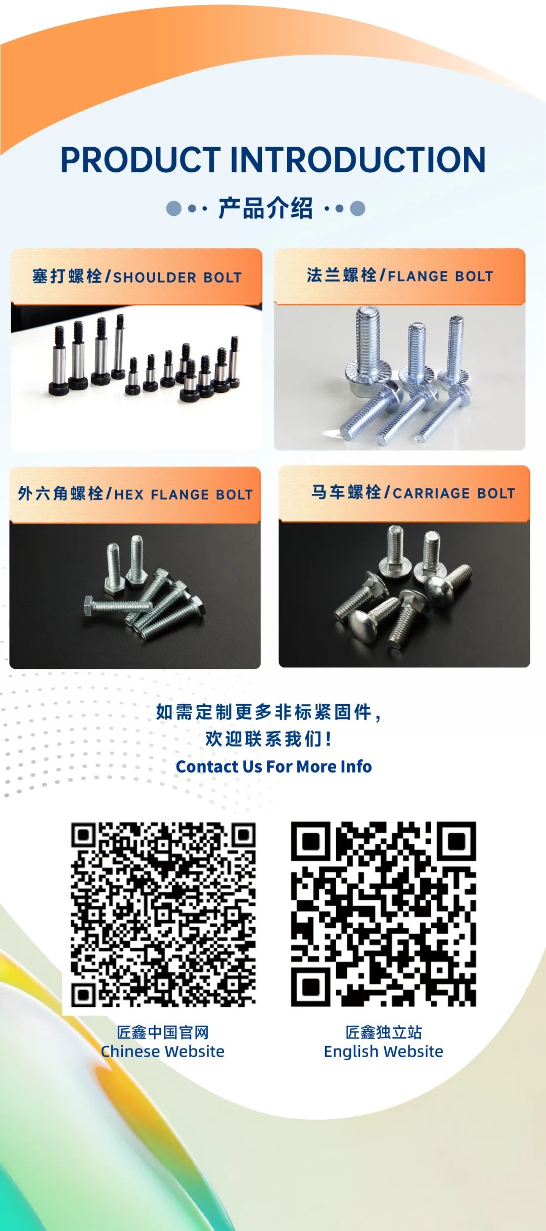 Skop perniagaan: bolt (bolt heksagon luaran, bolt heksagon dalaman, bolt gerabak, bolt bebibir, dll.), skru (skru mesin, skru gerudi, skru set, skru plag gred 12.9, skru kayu heksagon, skru mengetuk sendiri), nat (nat heksagon, penutup K, nilon, nat pengunci diri logam bercop, nat bebibir heksagon, nat penutup, siri nat rivet, dsb.), lain-lain (rivet separuh berongga, rivet langkah dan pelbagai pengikat bukan standard).